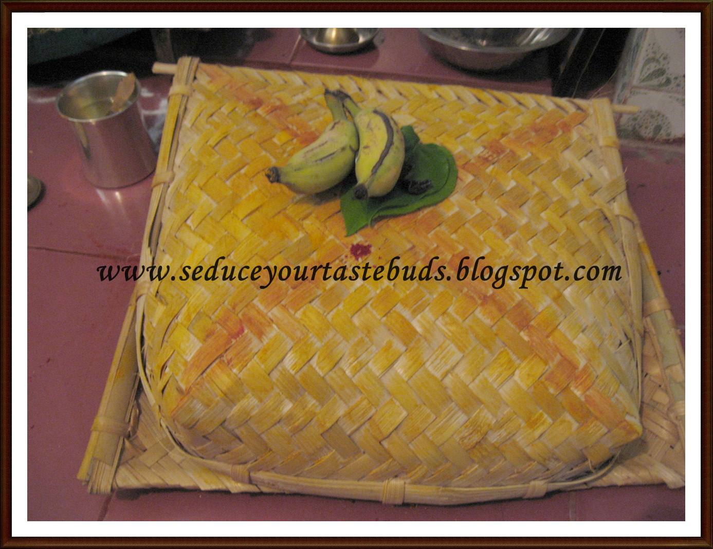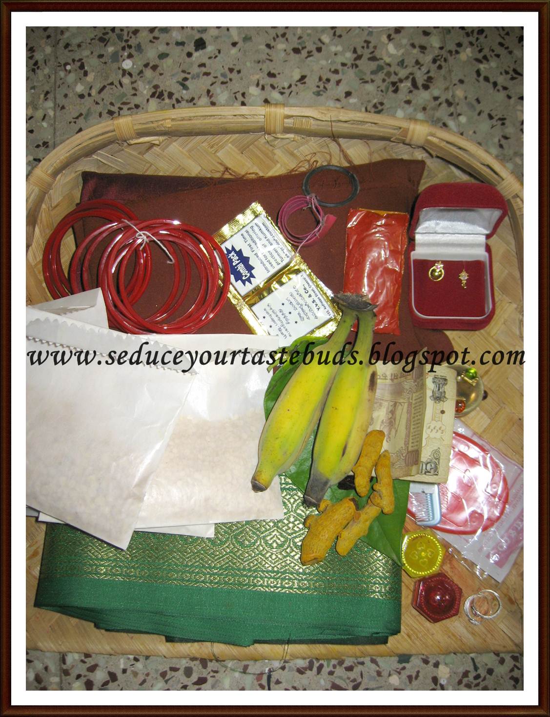 On one ‘Mora’ a dress material-Saree and blouse, bangles, mirror, comb , kajal, kumkum[vermilion], turmeric ,small packs of rice,rice flour,jaggery,moong dhal,toor dhal,silver toe-ring,gold nose pin,a ‘mangalya‘[A sacred pendent that is worn by married women],money are kept.Any other thing which is considered sacred is can also be kept along with these things.This is closed with the other ‘mora’.