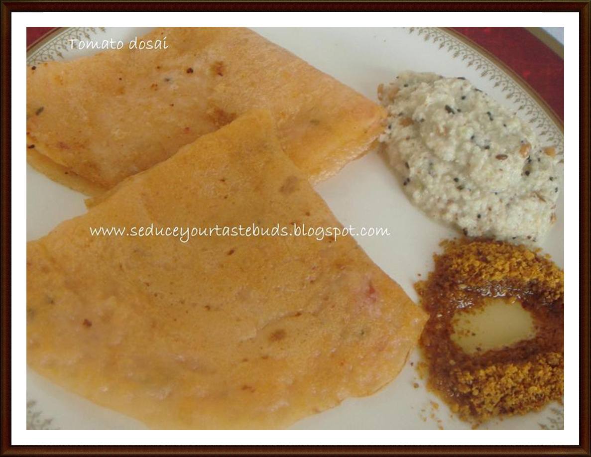 I tried this from Sailu’s blog with a few changes.The best part is that this batter needs no fermentation and can be used as soon as it is ground.If the tomatoes are ripe the color of the dosa will be brlliant.