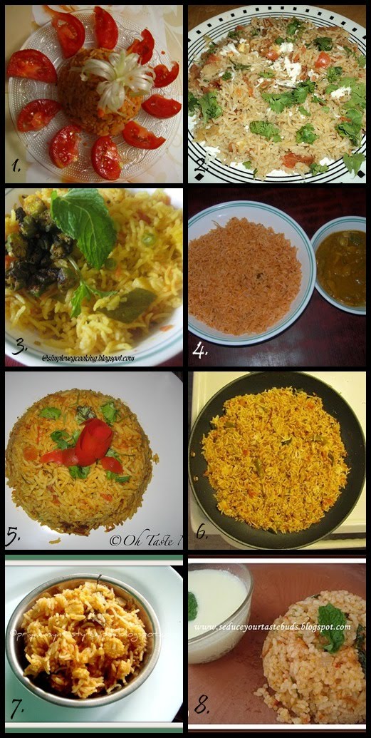 7.Priya of Priya’s Easy N Tasty Recipes–MW Tomato & Babycorn Pulao that is great for a potluck party as well as the lunchbox.
