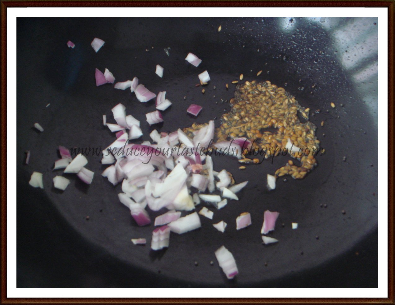 3.Heat oil in a pan and put in mustard,cumin and fenugreek seeds.When the mustard crackles,add the onion and saute till translucent.