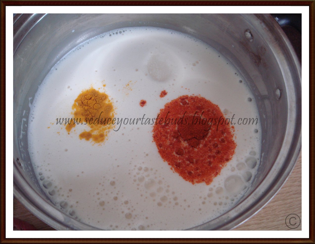1.Take curd in a bowl and add red chilli powder,turmeric powder and salt.