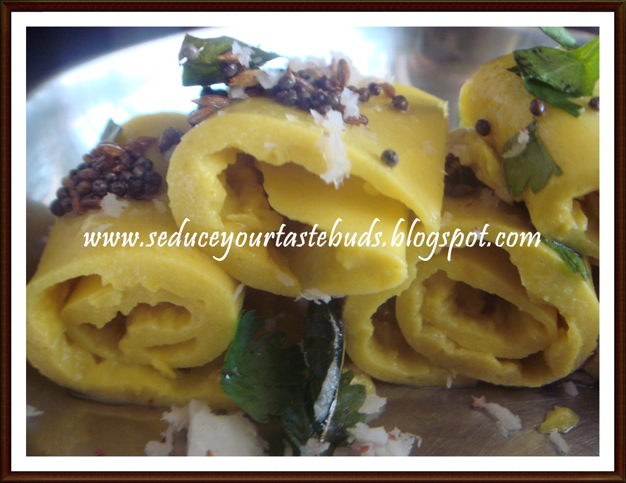 11. Arrange on a serving tray. In another small pan,heat oil and put in the seasonings.When it splutters pour over the prepared khandvi .Serve garnished with coconut and coriander leaves.