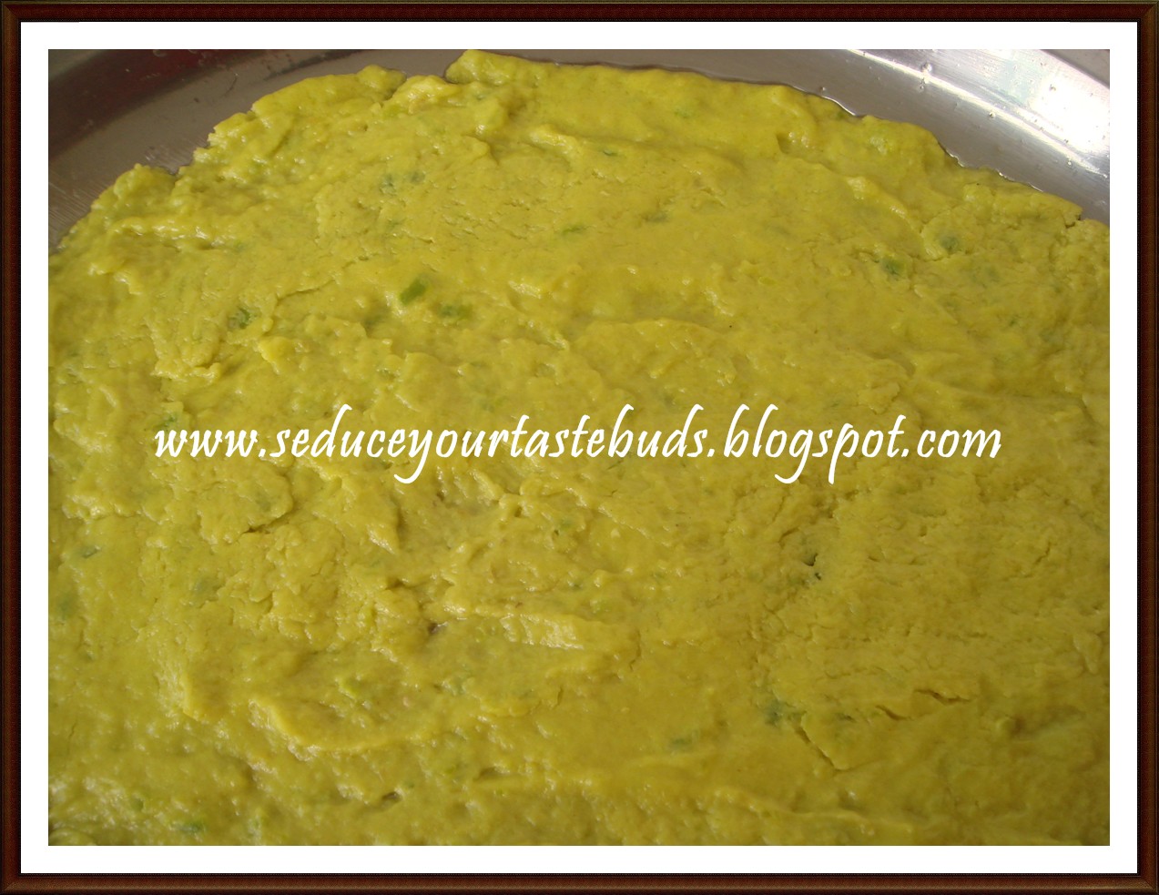 8.Transfer the mixture to the greased thali and spread it out evenly