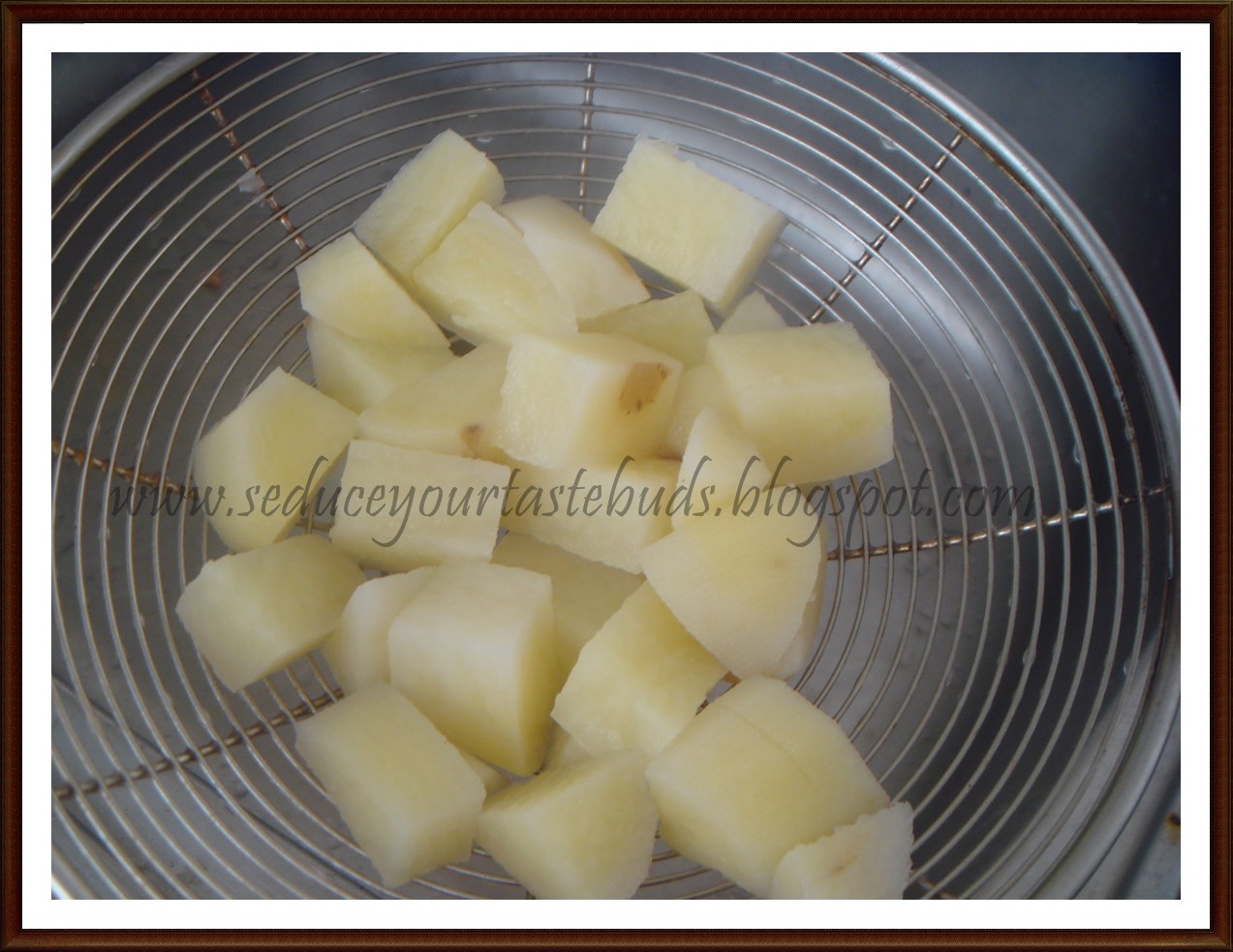 3.Peel the potato,cube and microwave with enough water for 5 minutes or till soft but not mushy.