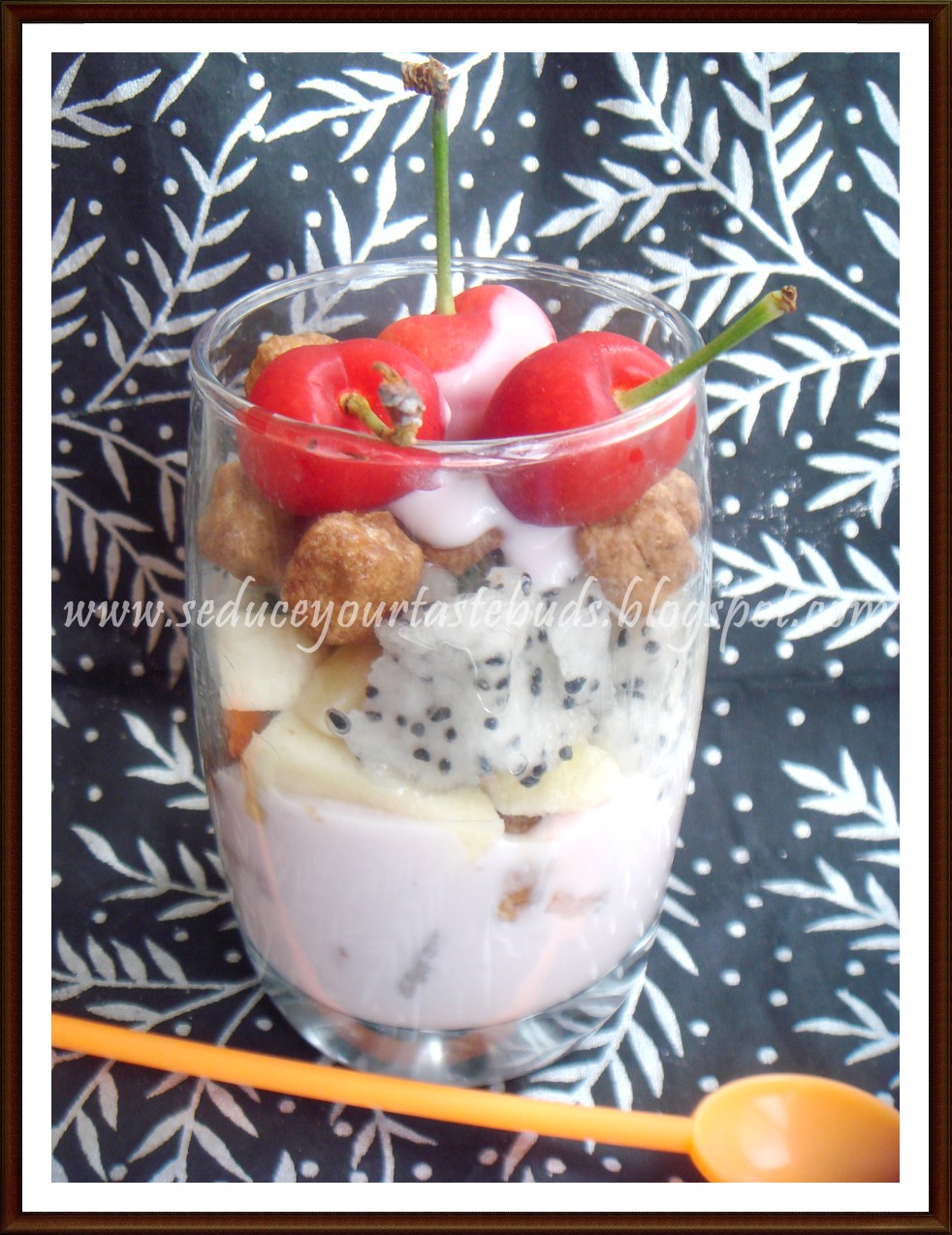 In a tall glass put in the fruits, add yogurt.Top it up with more fruits.Add the kellogs, drizzle more yogurt. Finish off with a few cherries.