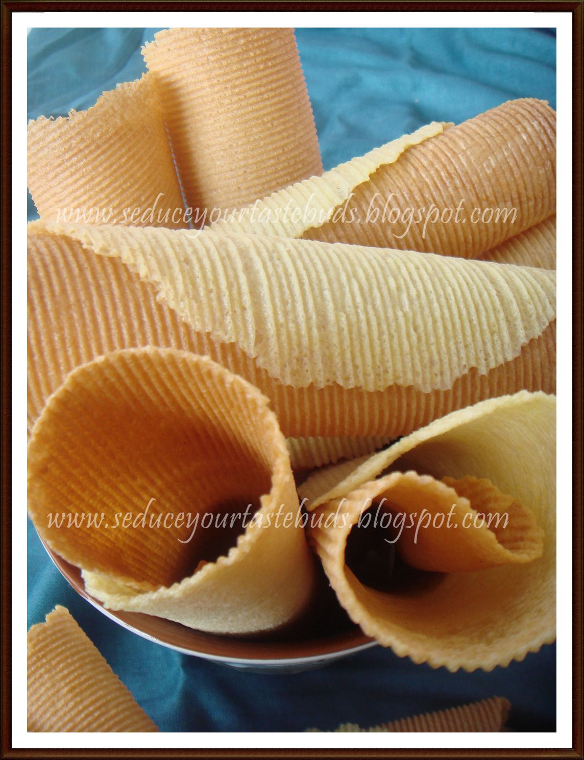 A batter of pouring consistency is prepared with the cornflour, sugar and sesame seeds. A small equipment that looks like a waffle maker is heated and a ladleful of batter poured on one surface and closed for a few seconds. It is quickly rolled while hot and taken out of the equipment. Once it cools it becomes crunchy…..