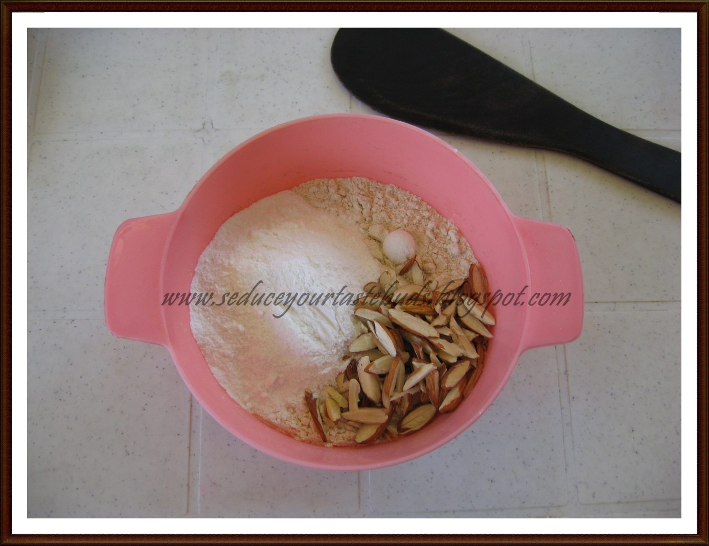 2.In a bowl mix together flour,sugar, salt and almonds