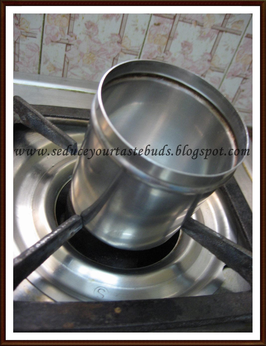 To prepare the perfect cup of Kaapi, one must not heat the milk and the decoction. Here is what must be done.Pour the required quantity of decoction into a tumbler.Yes, a stainless tumbler and not a cermaic / porcelain mug cup. In a vessel heat milk till it is almost boiling. Add sugar and stir to mix. Pour the piping hot milk over the decoction in the tumbler and serve.As you can see this kapi is served in a Davara-Tumbler as it is called.The vessel that holds the tumbler is the Davara.
