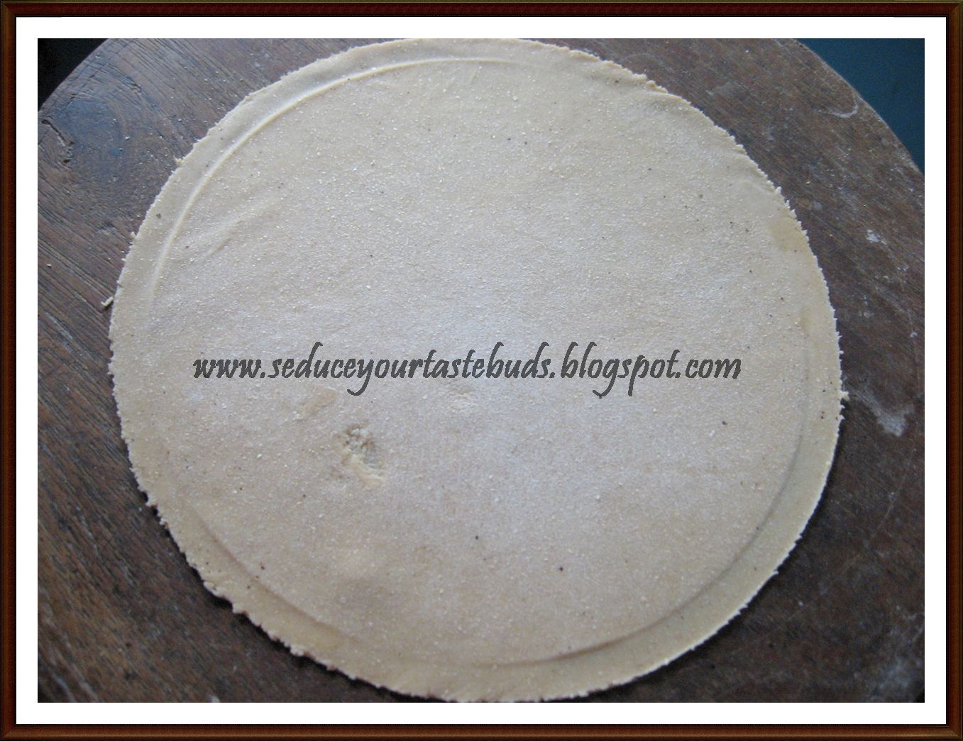 9.Pinch out 2 small balls of dough and roll each one as thinly as possible into circles.[ Both should be equal in circumference.Use a plate to mark the paratha and cut out to equal circles]