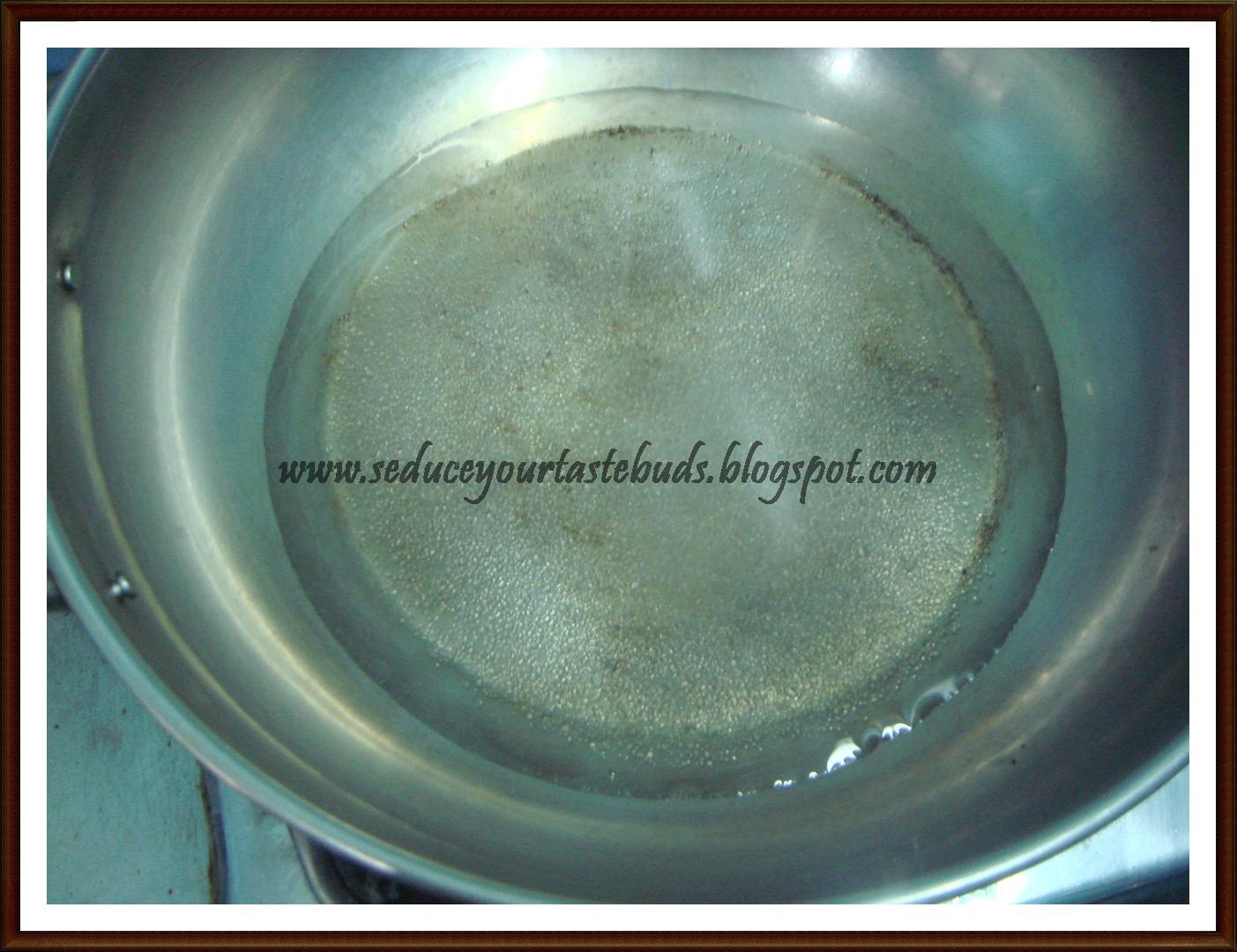 6.Meanwhile prepare the sugar syrup.Heat sugar with 1.5 cups of water and prepare a sugar syrup. The syrup should be slightly sticky to tough.