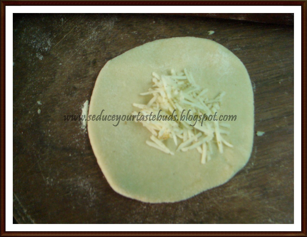 3.Pinch a small piece of the dough and roll out. Place the cheese filling in the center.