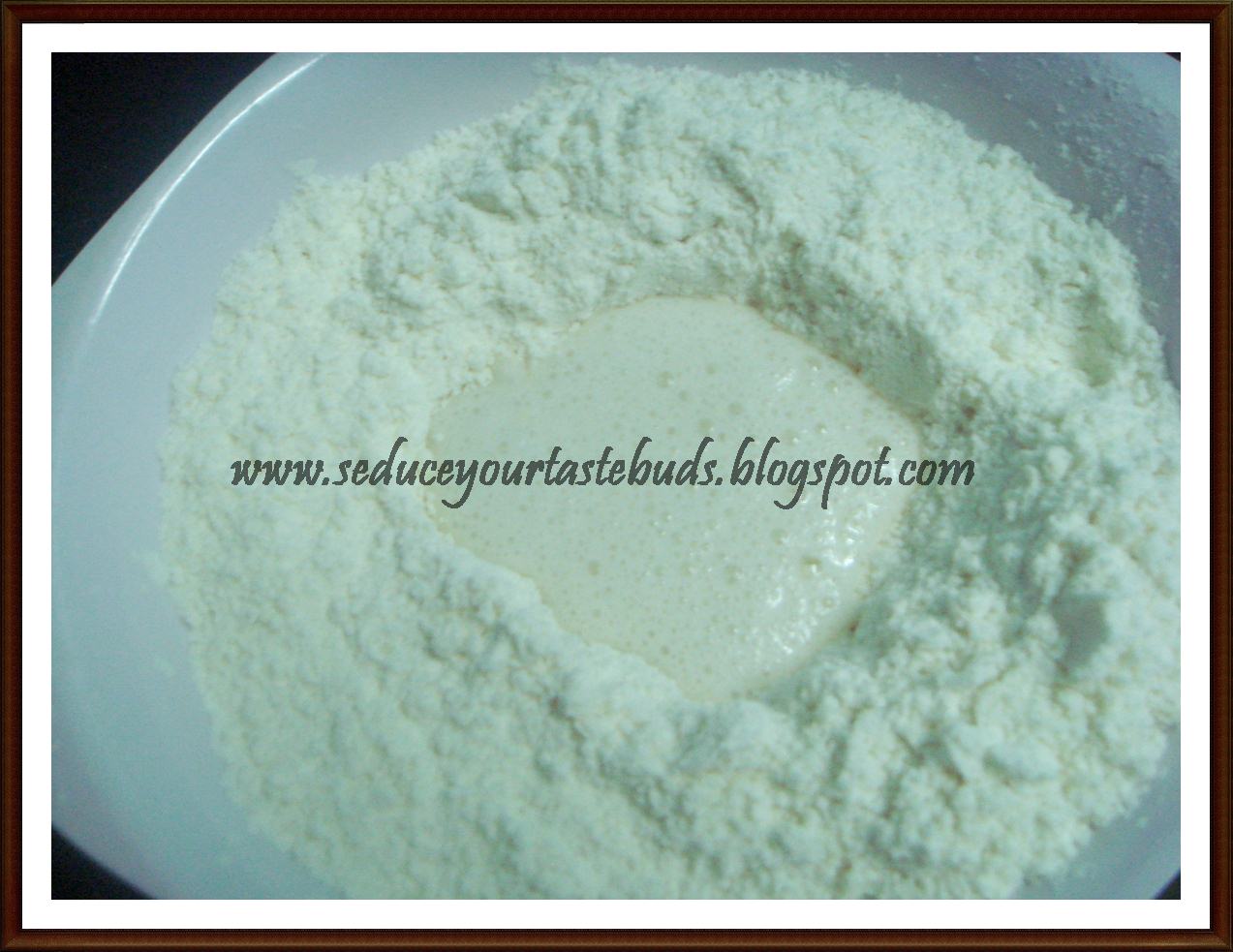 5.Make a well in the center and add the yeast mixture. Mix well.