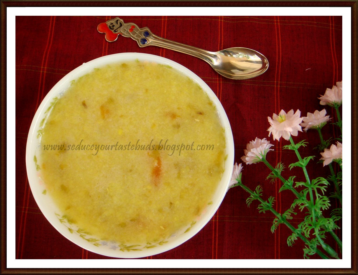 After the simple carrot – beet soup yesterday, its time to move on to a more ‘sophisticated’ dish for the tiny tot.Once the baby starts on solids and you have introduced cereals,this type of combo meal [cereal-pulse combo]can be started.It is very healthy dish.This kichidi is very different from the adults version….