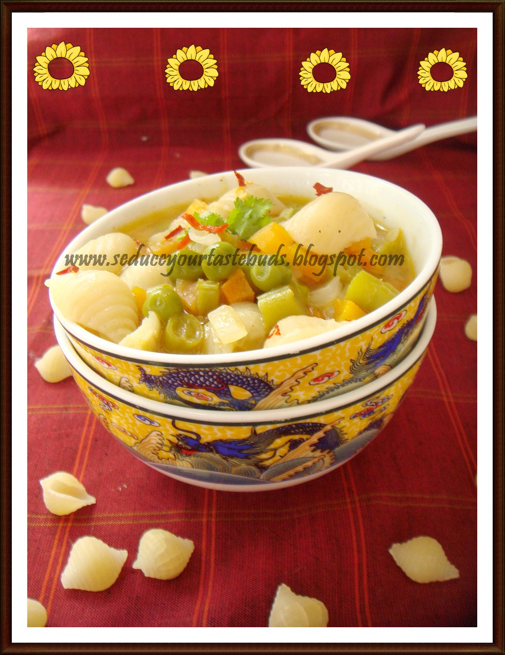 Once again a pasta dish! Lil Angel is head over heels in love with pastas and I find it easier to get her to eat if there is pasta in the dish that she normally refuses. Of late,she detests soups except her favorite drumstick soup, so I am finding ways and means to get her to take in vegetables and this soup serves two purposes. It has veggies and is filling!