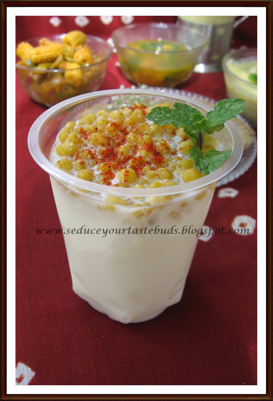 - Serve topped with boondi , red chilli powder