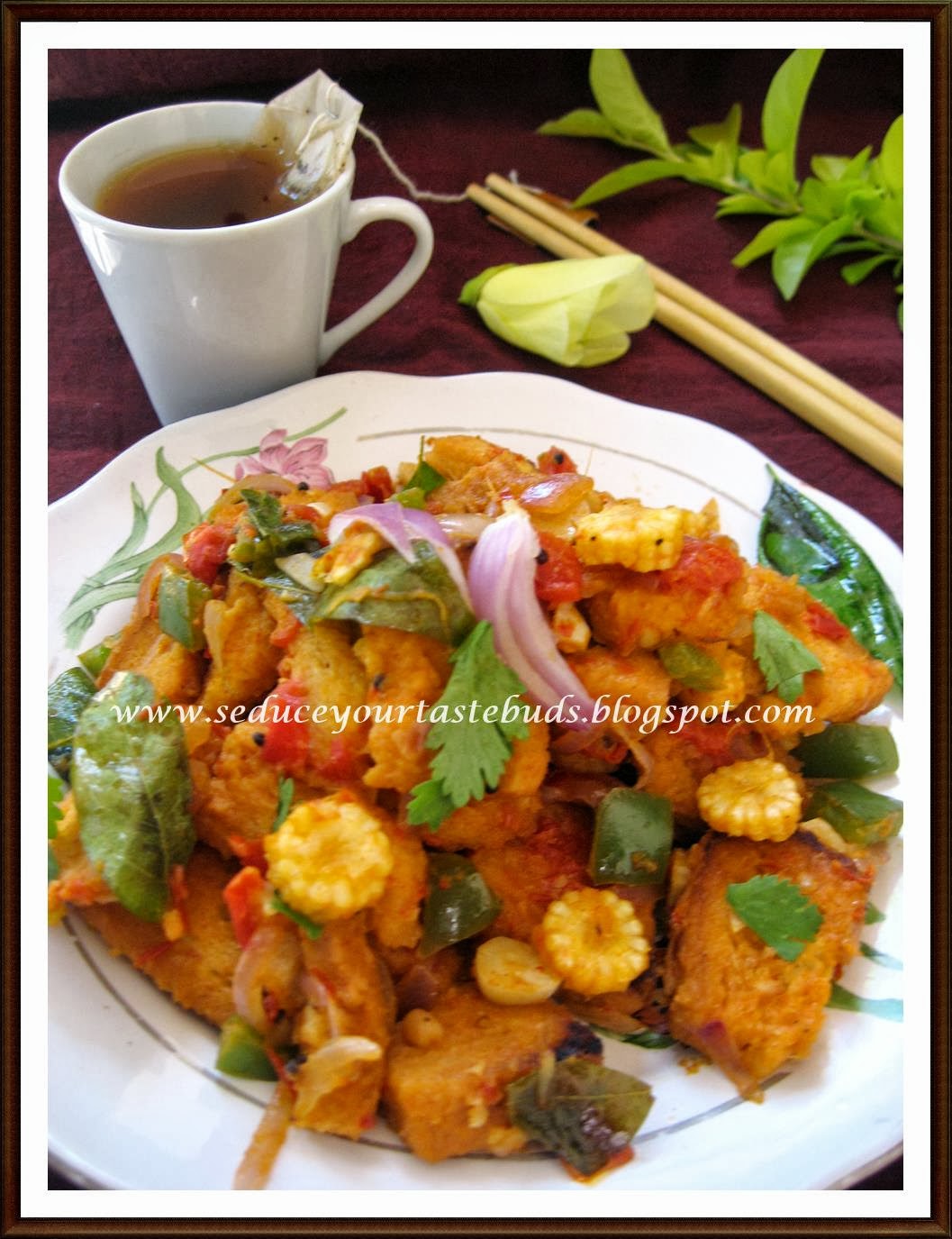 This dish can pass off as a light meal / an after school snack. It is very simple and can be put together in a few minutes.