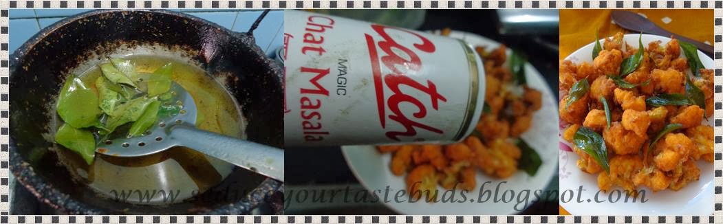 Deep fry the curry leaves till crisp.This will hardly take time to fry so be careful not to burn them. Plate the fried cauliflower ,sprinkle chaat masala and garnish with fried curry leaves.