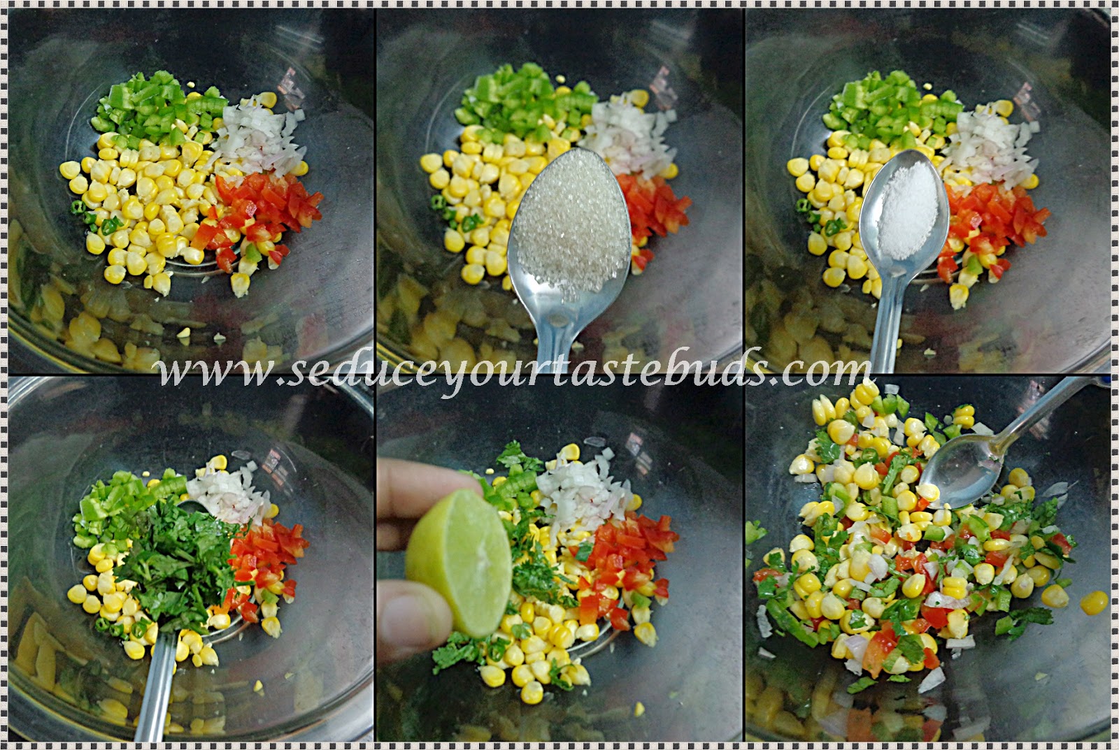 Steamed corn from 1/2 a cob,1 small tomato,chopped, 1,small onion,chopped,1/4 bell pepper,chopped,1/4 teaspoon sugar,1 green chili chopped salt, lemon juice to taste,chopped coriander leaves.Mix well