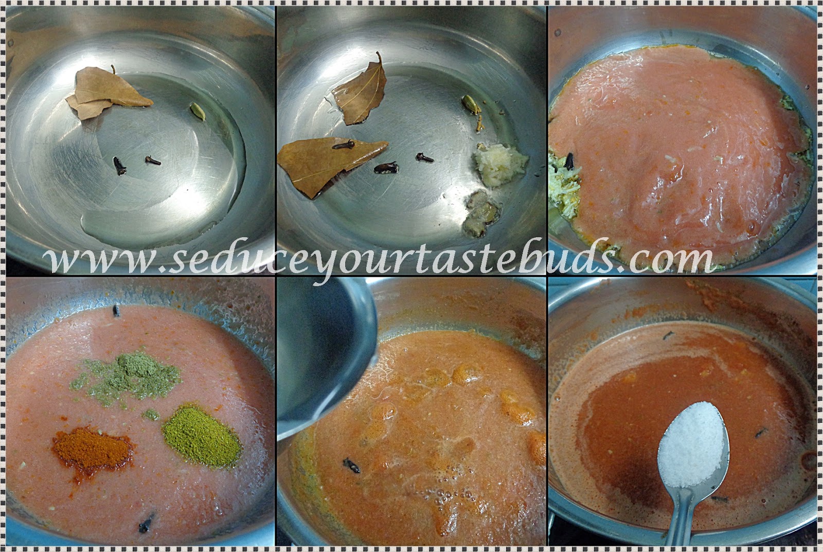 Heat oil in a pan and add the bay leaf, cloves and cardamom. After a few seconds, add the ginger garlic paste. Saute till the garlic paste turns a little brown in color.Add the tomato puree, the masala powders and bring to a boil. If the mixture is too thick, add water .Then add salt.