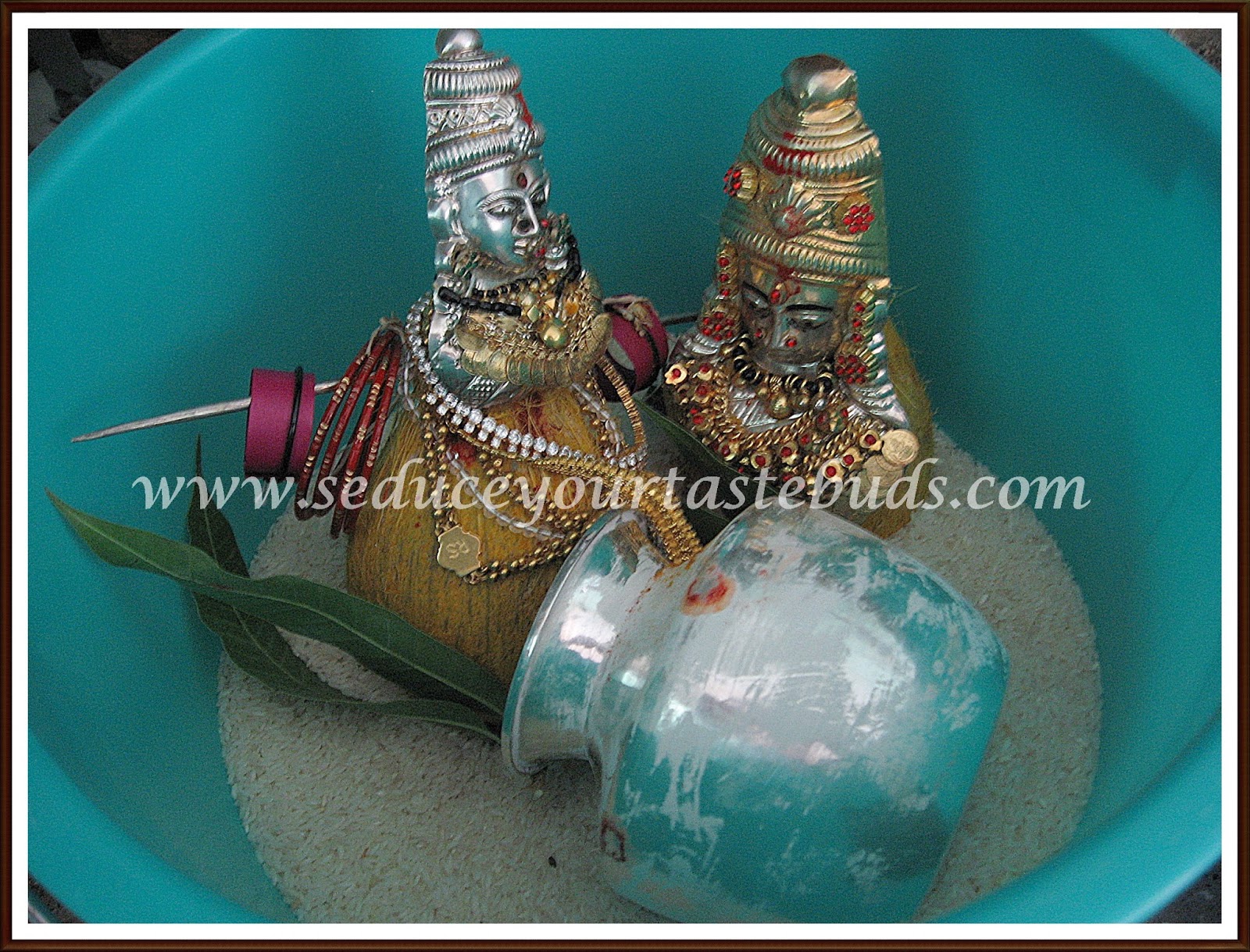 Mango leaves are placed on the rim and a coconut is placed on top of the mango leaves.A silver rod is tied through the top part of the coconut and on either side of the rod, bangles, bicholay ,Karumani[A small bangle like thing made out of palm leaf, karumani is the black beads that married women wear].The face of Lakshmi is tied to the coconut and she is decorated with necklaces, ear rinds, flower garlands, a flowery plait etc.