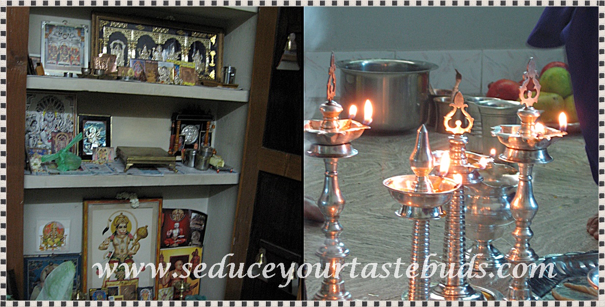 On the day of the Vratha, the women take head bath and do the pooja while fasting. Some people don’t even have their morning cup of coffee!