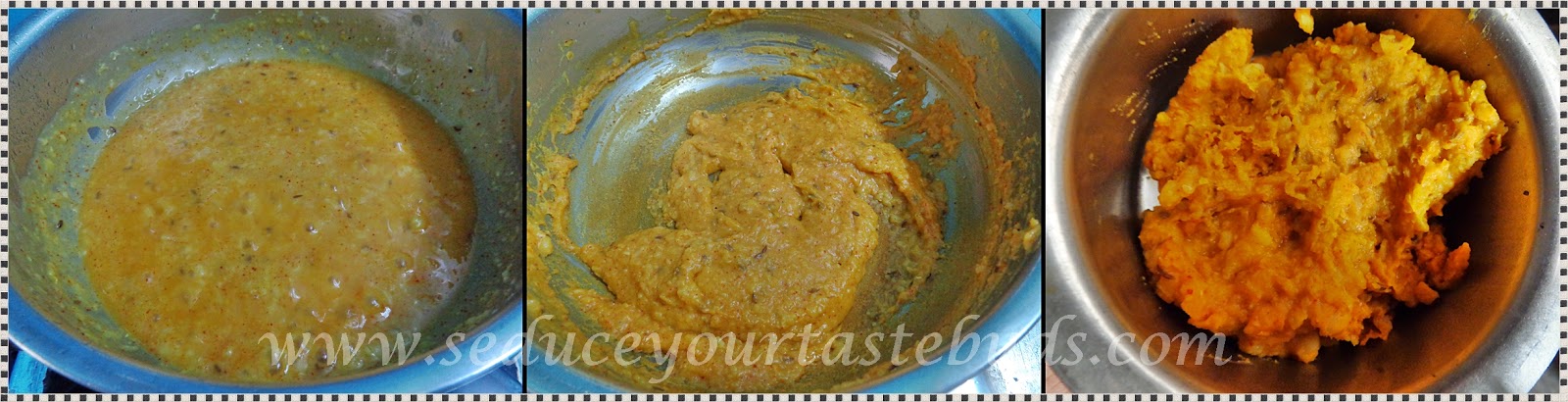Mix well and keep cooking till the mixture thickens and becomes dry.Remove into a bowl and keep aside to cool.