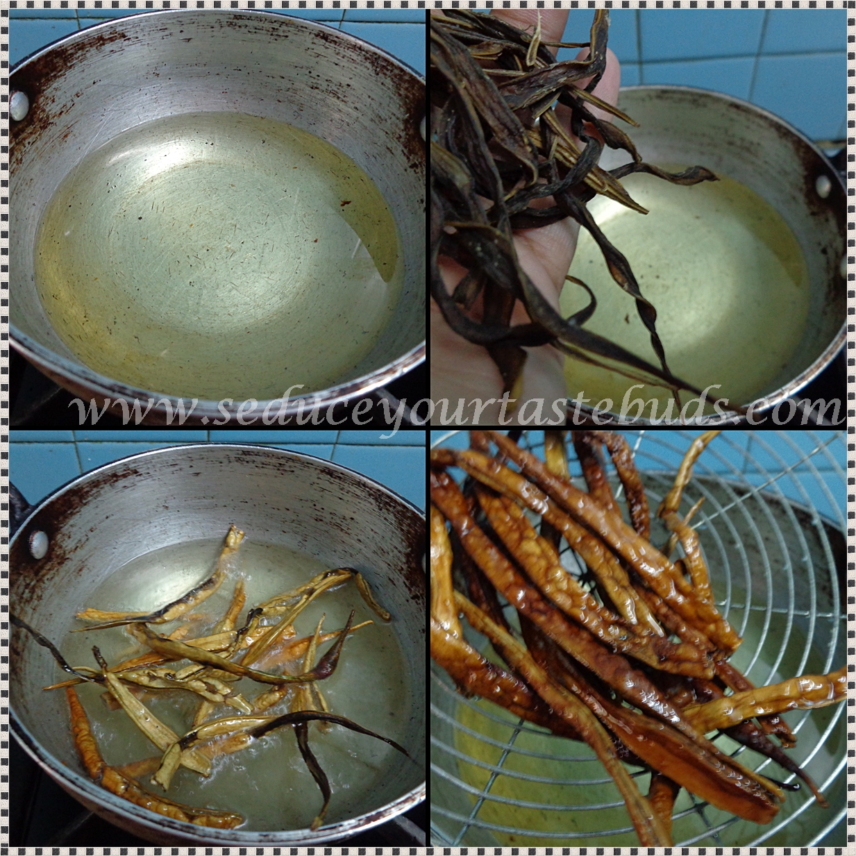 Heat oil in a pan and gently drop a handful of the dried cluster beans.It will swell up and the color will change as seen in the pic below. Drain and serve.
