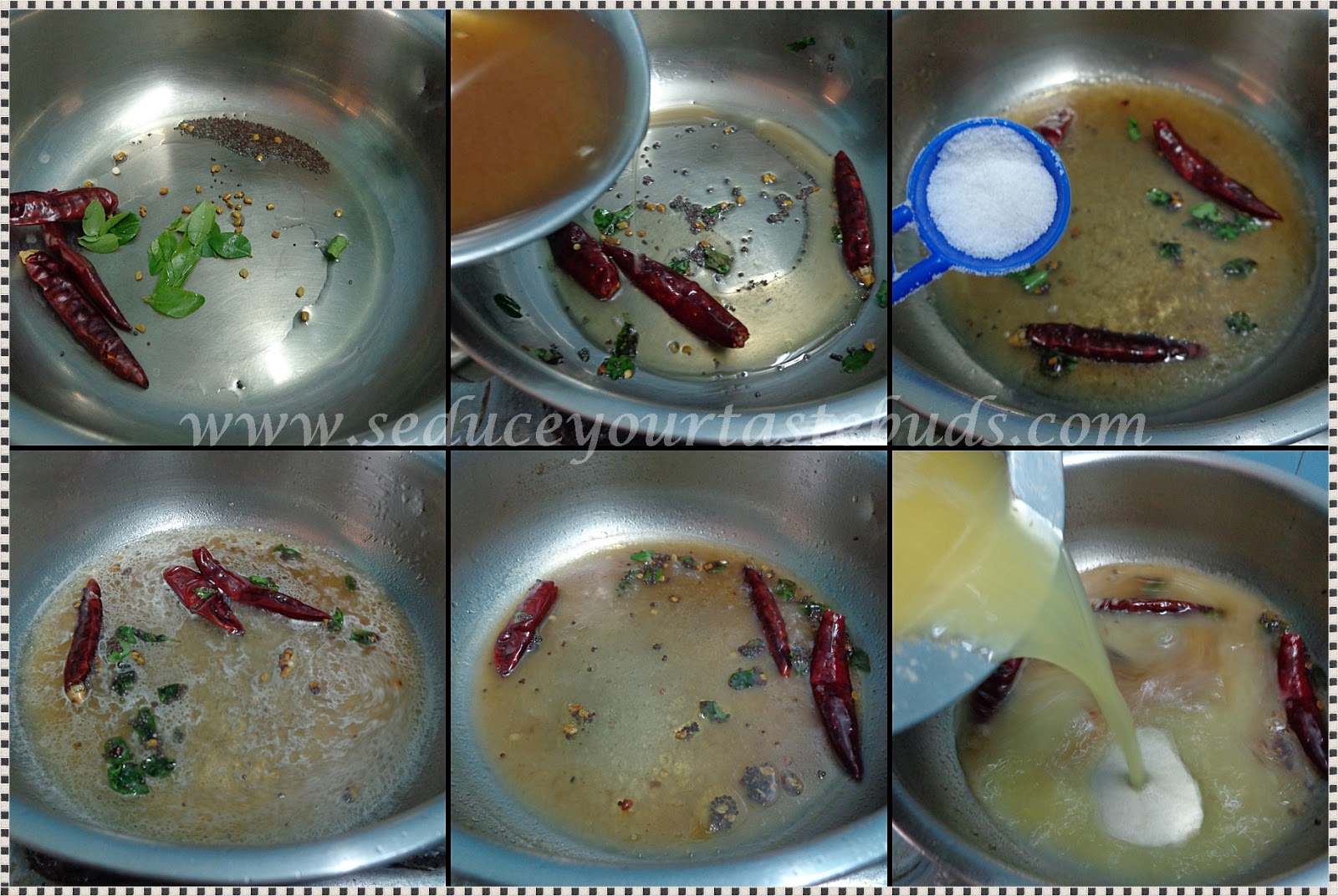 Heat oil in a pan and add mustard, fenugreek seeds,chilies curry leaves. When the mustard splutters, add the tamarind extract and salt. Bring to boil.When the tamarind extract reduces in volume, add the cooked dal along with the water used to cook it.
