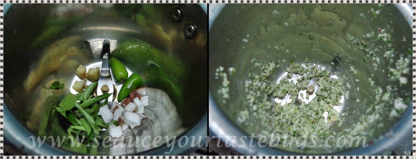 Grind together curry leaves, ginger, coconut and green chilies to a coarse paste. This step is optional. All these ingredients can be finely chopped and added to the batter. Since the kids don’t like to bite into green chilies, I ground it along with the other ingredients.