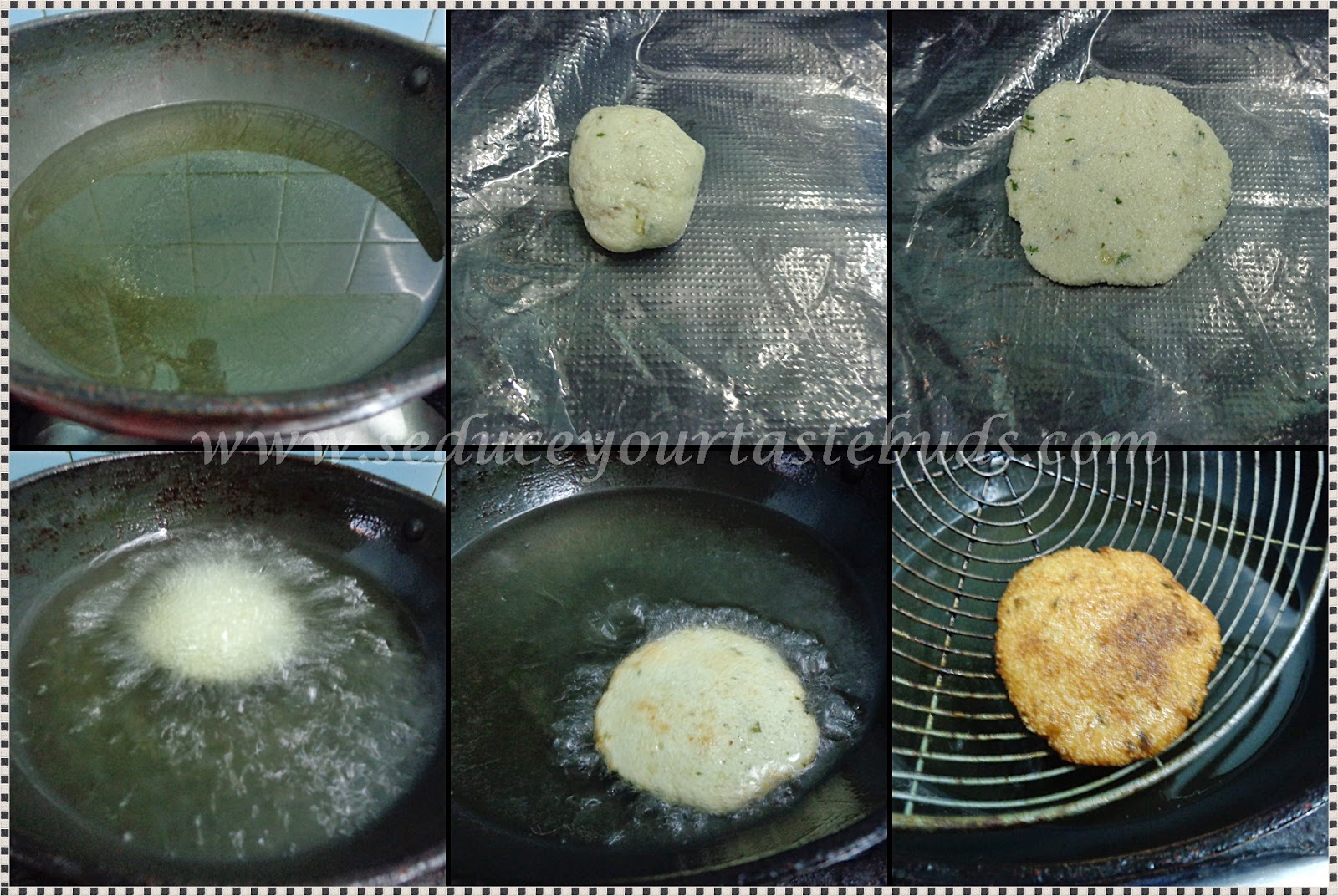 Heat oil in a pan.Slightly grease a plastic sheet and your fingers and take out a small lemon sized ball of dough and pat it into a circle. Gently remove from sheet and drop in into the oil.Deep fry till golden brown on both sides. Repeat for the rest of the dough.