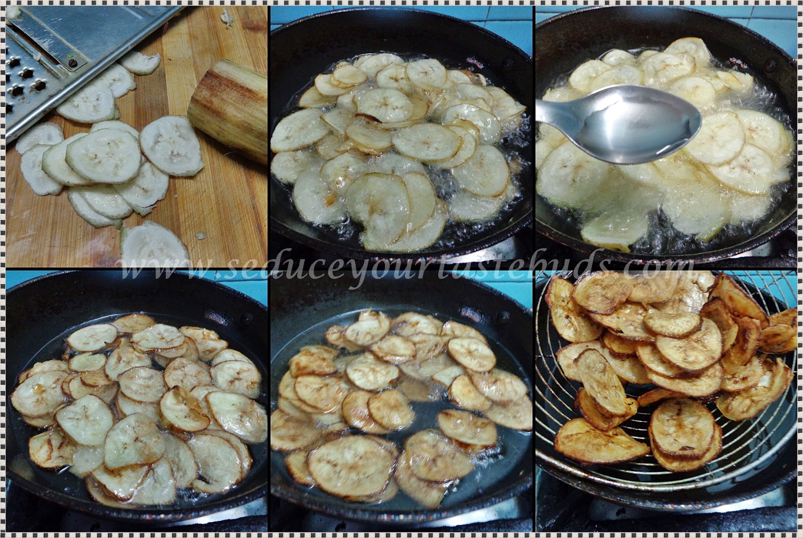 Meanwhile,peel and slice the raw plantain into thin circles. Drop them into the oil.Make sure you don’t add it as a clump as it will stick together and will not get cooked evenly. Once the sizzling comes down, add a little of the salted water into the pan.Don’t worry, it will not splutter. If you are really worried stand a little away from the stove. But trust me, it won’t splutter.