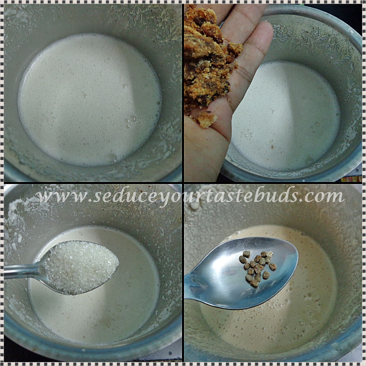 Grind to a smooth batter adding water little by little. Add jaggery, cardamom and grind once again. Remove onto a vessel.