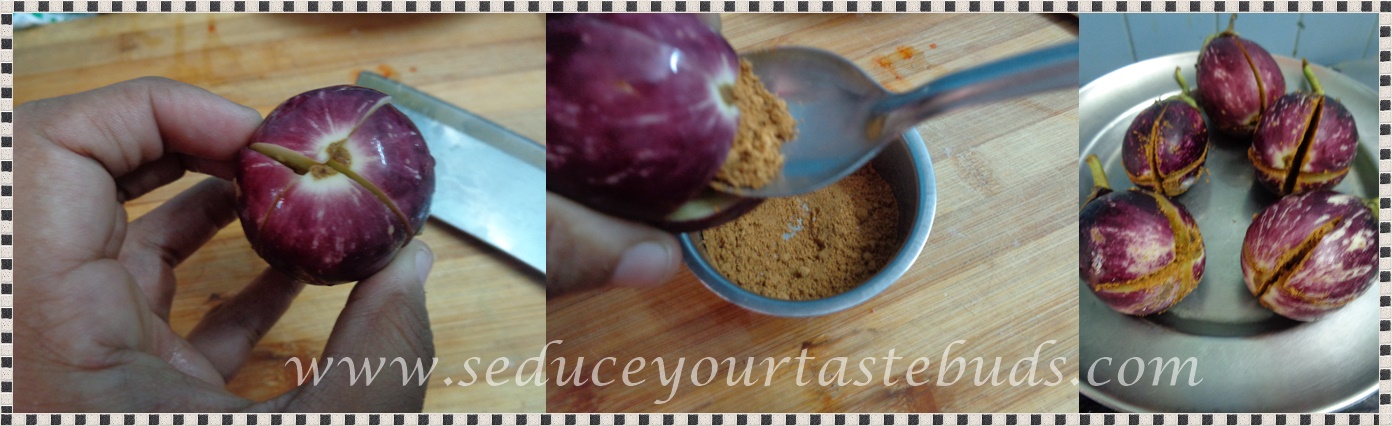 Wash and pat dry the brinjal and make X shaped slit marks as shown.I kept the stalk intact. You can trim it if you prefer. Fill the brinjal with the spice powder and keep aside.