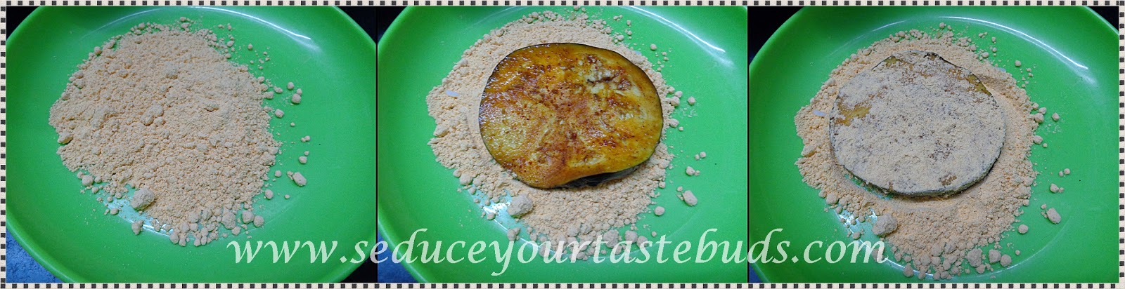 Take the besan in a plate and coat the brinjal slices evenly on both sides.