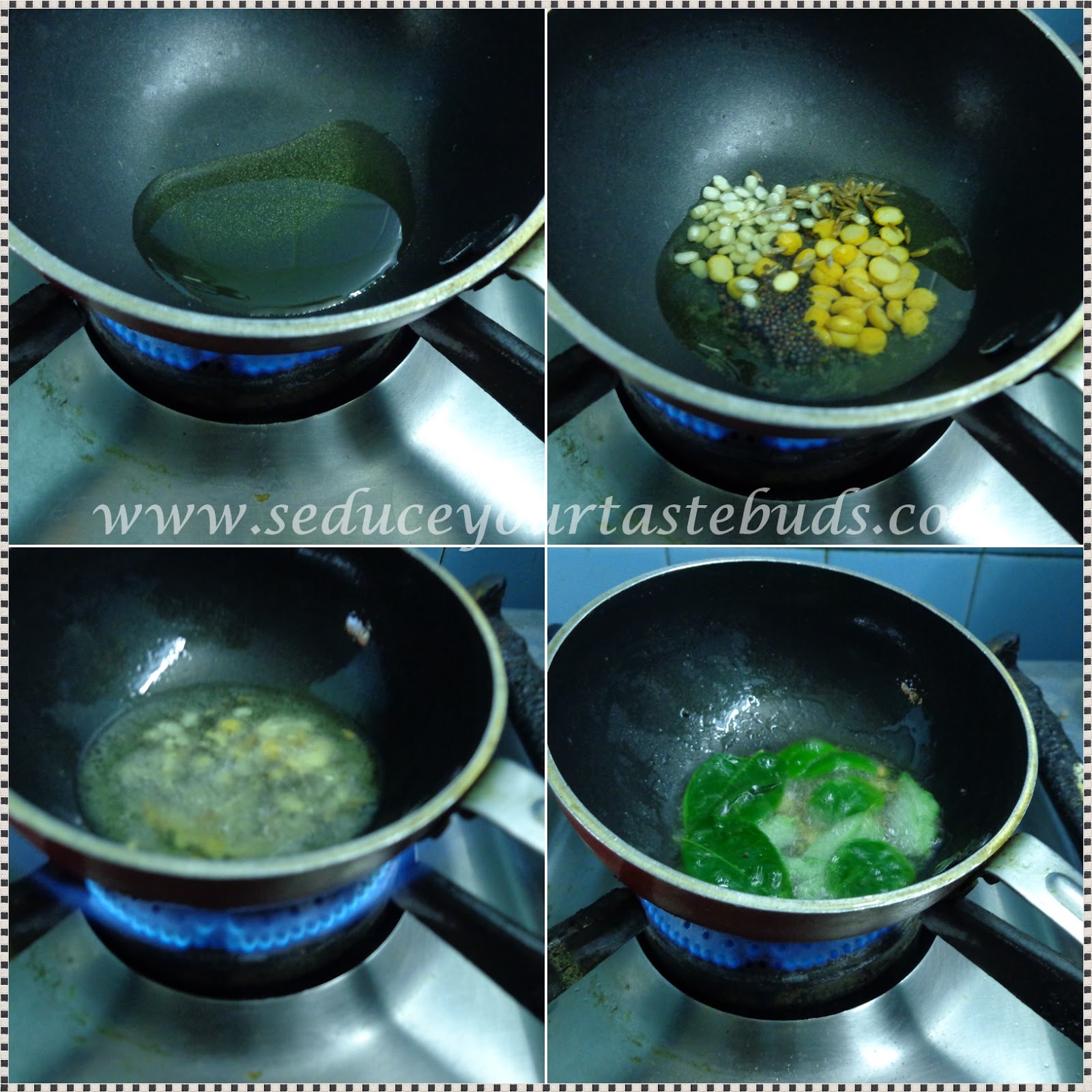 In a small pan, heat oil and add the ingredients for seasoning except curry leaves. Once the mustard pops and the dal turns brown, add the curry leaves and remove the pan from heat.