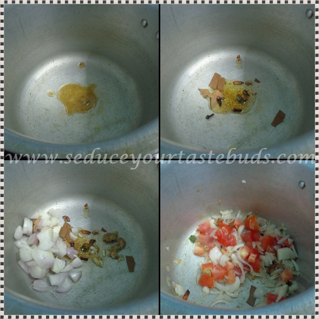 Heat ghee in a pressure cooker and add the whole spices.Saute for a few seconds and add onions and saute till the onion is soft. Put in the tomatoes.