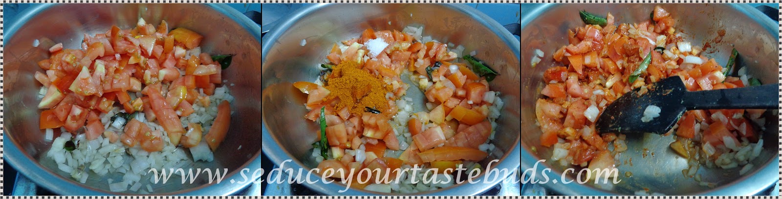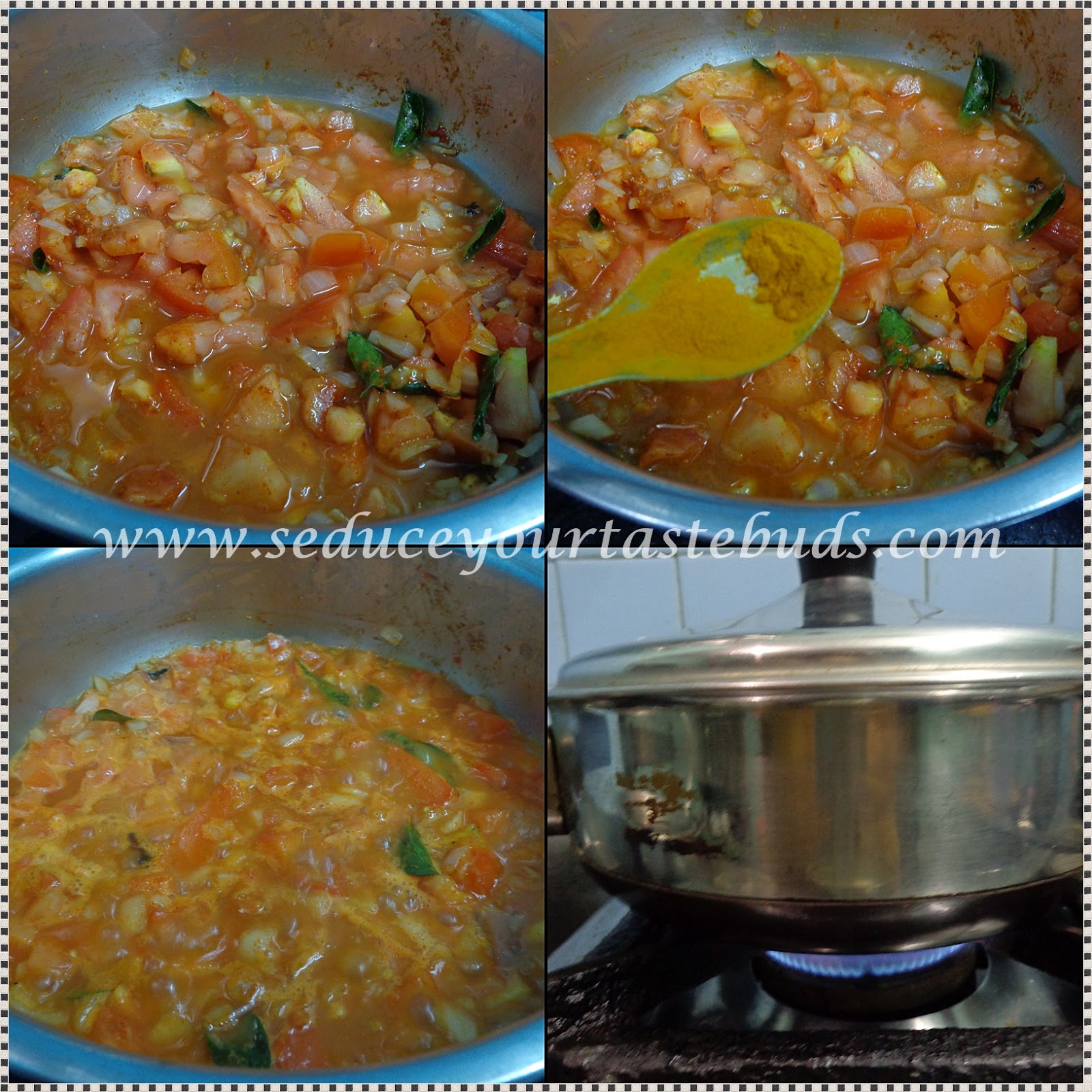 Add a cup of water , turmeric powder ,salt and bring to boil. Cover and cook till the tomato turns mushy. Stir a couple of times in between.